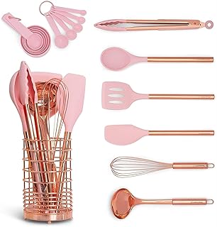 HOUHOU Rose et ustensiles de Cuisine en cuivre Set avec porte-17PC Rose de Cuisson Ustensiles Set avec Support, Rose Tasses à mesurer et cuillères Set, Cuivre Ustensiles de Cuisine et cuivre Ustensil
